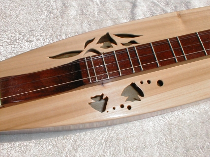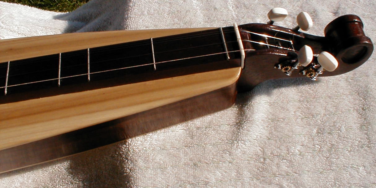 In April 2002, while attending the Escapees Club Woodcarvers get together at North Ranch in Congress AZ, we enjoyed an evening of dulcimer music when about eight of our fellow woodcarvers had a Jam session. Fran was hooked instantly and "had to have one". I was interested to learn that a couple of the players had made their own dulcimers from kits. Well, it wasn't long before we purchased a dulcimer for Fran and a kit for me to build... Fran didn't want to wait for me to finish the kit. I have purchased several kits over the last few years. As a full-time RVer I don't have the luxury or a wood shop full of the necessary tools and machinery needed to make dulcimers from scratch but the kits eliminate that need. Still it does take a few tools that take up space in the RV. It's a lot of hassle to pack the tools away so I don't do any dulcimer work unless we're going to be at a place for a while. Also, since my workshop is the great outdoors the weather has to cooperate so I don't get to make as many as I'd like to. My first MountainDulcimer |