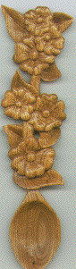 Budding LoveAn original design with a lot of dimension and interest. Flowers symbolize friendship or affection. Maybe this spoon would be a good gift for a budding friendship. A light color wood with subtle graining. Carved from Butternut. Natural finished with semi-gloss Deft. 10" long x 2" wide Price = SOLD |